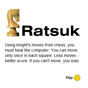 Забавная логическая головоломка. Вам предстоит выиграть компьютерного оппонента, совершая ходы конем. Если у вас больше нет ходов - вы проиграли. Великолепная разрядка в обеденный перерыв.