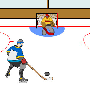 Играем в хоккей с шайбой на льду за нападающего нашей сборной. Ваша задача состоит в том, чтобы обвести голкипера и забить гол в створку ворот противника.